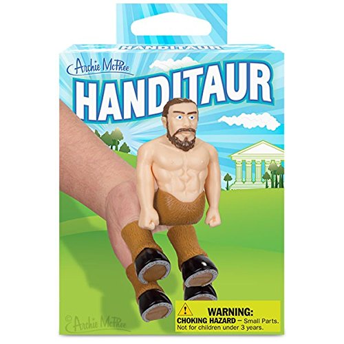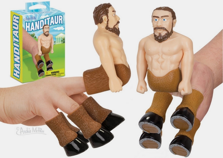 We'll admit that having a hand is practical, you can pick things up and press buttons, but wouldn't you rather have a centaur on the end of your arm? Here comes Handitaur! It's a set of five soft vinyl finger puppets, four 2" hooves and one 3-1/2" torso, that takes your hand from humdrum reality into the realm of fantasy. This product will change the world. Instead of shaking hands, people of the future will bump centaurs.