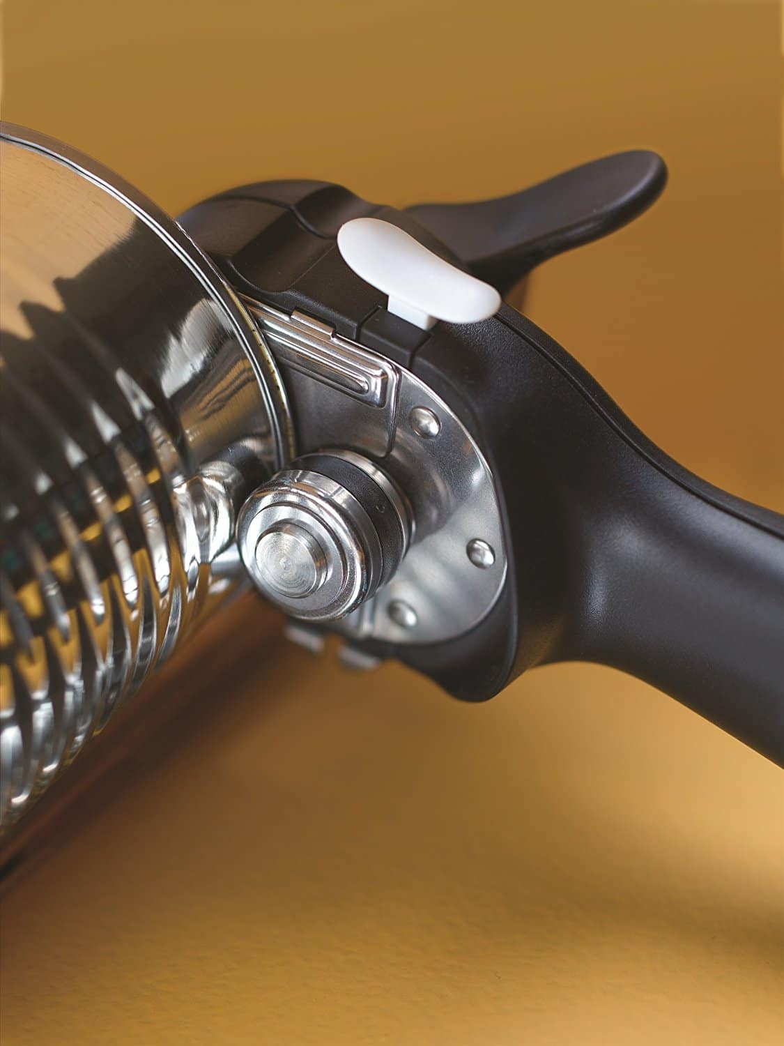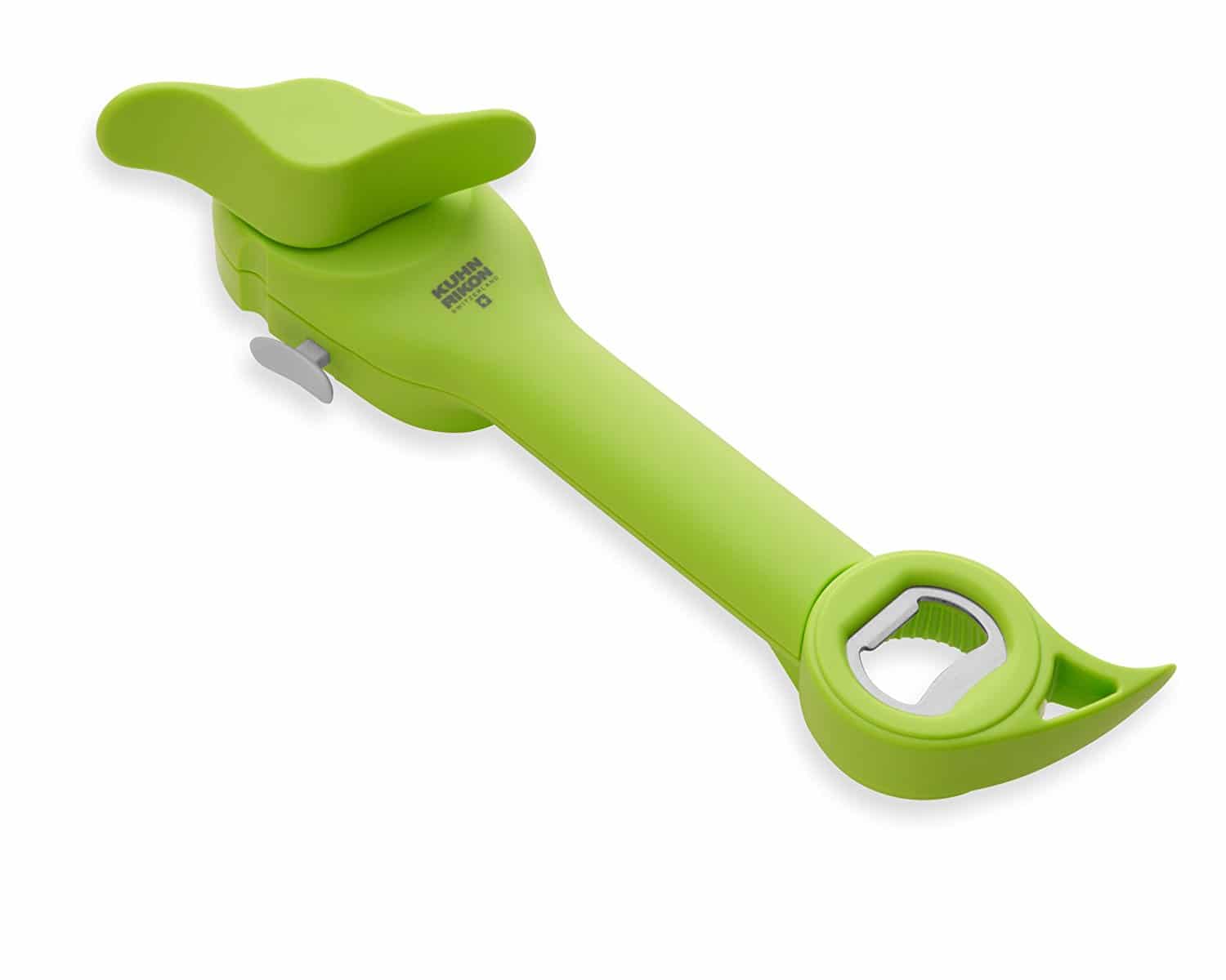 The Swiss are famous for packing multiple tools into a single package. The Kuhn Rikon Auto Safety Master Opener has all the features of the Kuhn Rikon Auto Safety LidLifter can openers. It is now possible to open a can and never, ever touch the lid. All you do is place the opener on the can and begin turning the comfortable knob. The tool automatically locks in place. The tool cuts from the side leaving a rim smooth, not sharp or jagged. The tiny, strong jaws on the side of the opener remove the lid. Press down on the white button to close the jaws on the lid and when you are ready to drop the lid into the recycling container, just release the button. Safe, ergonomic and just plain cool. Plus, it makes quick work of opening bottles and cans with pull and pop tabs, threaded caps and flip tops. 8-3/4-inch, Green