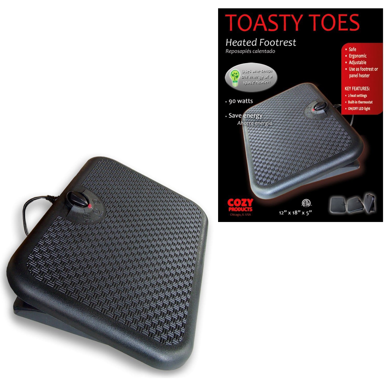 The Toasty Toes ergonomic heated footrest provides much needed warmth and relief to tired and cold feet. Dual-tasking, this unit provides ergonomic support as it warms. The Toasty Toes is adjustable in 3 positions and fits perfectly under a desk or in front of your favorite chair at home. The provided warmth is not only adjustable through a three setting switch, but it also helps to promote circulation within your feet. There are no hazards of tipping or overheating since the device only draws 90 watts of energy (compare that to a standard 1,200 watt space heater); about the same amount as a standard light bulb.