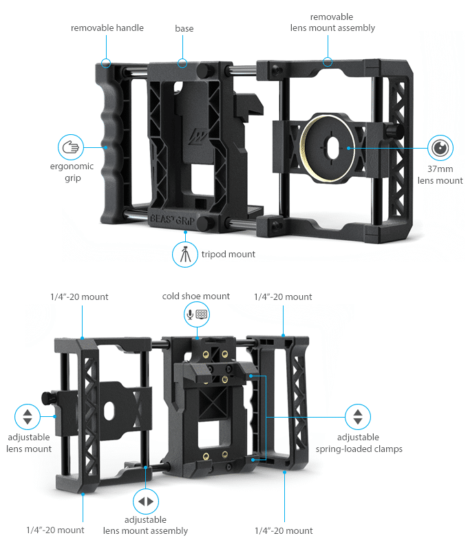 The Beastgrip Pro is a versatile, universal, and fully-adjustable smartphone lens adapter and camera rig system that's packed with features to expand the shooting capabilities of your smartphone camera. It’s extremely durable, uses industry standard lens and accessory mounts, and most importantly, works with all smartphones (with or without a protective case), making it the most advanced phoneography tool in the world. The Beastgrip Pro + Wide Angle Lens bundle includes a Beastgrip Pro and a Wide-Angle lens with a detachable macro lens for detailed close up, and immersive wide-angle shots.