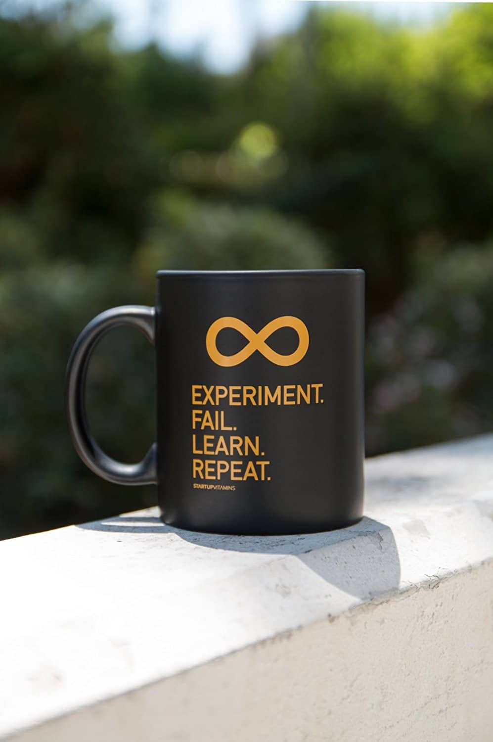 Glossy ceramic mug, with the quote ''Experiment. Fail. Learn. Repeat.'' printed on both sides