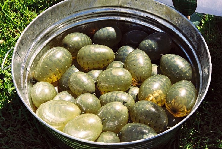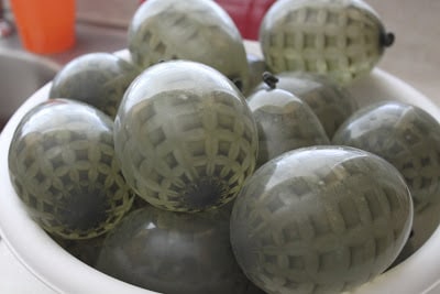 These grenade shaped water balloons are sure to be the talk of your party. Package of 100 military green latex rubber balloons that expand to 4 inches when filled with water. Warning: Choking Hazard - Children under ages 8 years can choke or suffocate on uninflated or broken balloons. Adult supervision required. Keep uninflated balloons from children. Discard broken balloons at once.