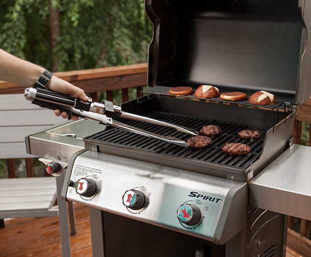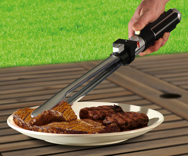Here are Darth Vader inspired BBQ tongs, perfect for turning your meat to the Dark Side. The tongs are shaped just like Vader's famous weapon with a heat resistant handle and red storage case. The tongs also feature classic Lightsaber sound effects so you can rule the BBQ as well as the galaxy.