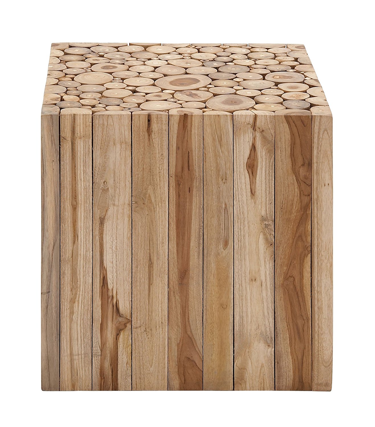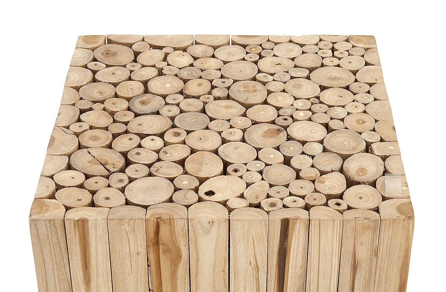 16" organic inspired arranged teak wood stump square stool, vertical stumps with cut log frame and sliced wood top form smooth natural surface, flat bottom base.