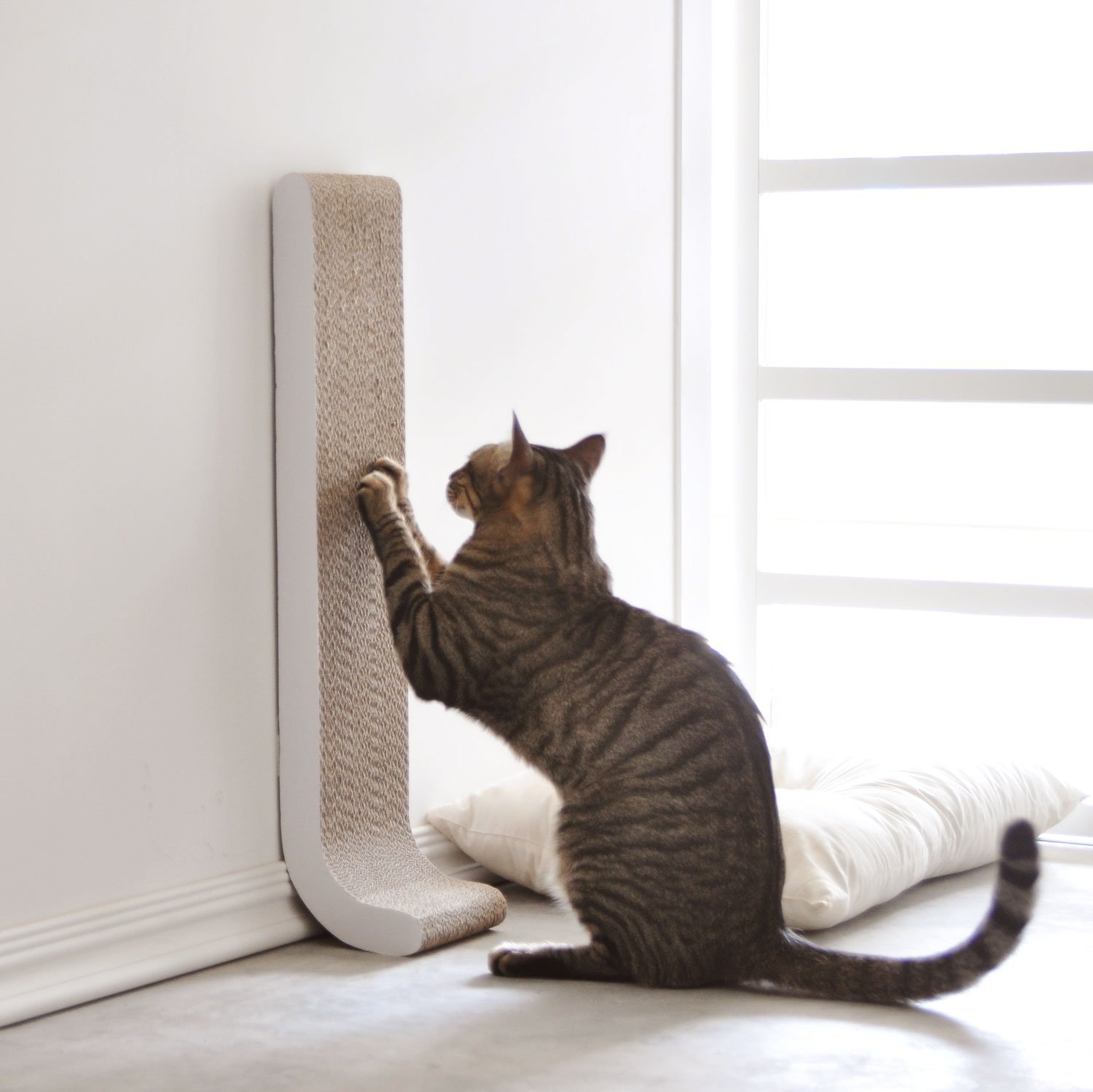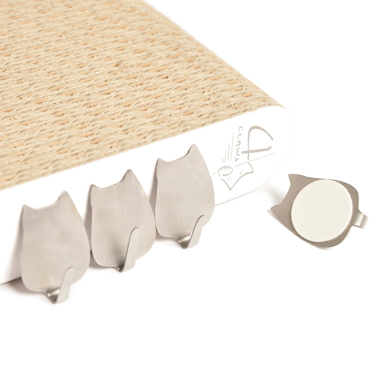 The Scratching Post is wall mountable and sturdy enough for your cat to rest its weight on it while scratching and stretching. The hooks are mounted with adhesive pads which are easy to install on any clean vertical surface such as a cupboard or wall. The scratching post is 26" tall, allowing sufficient room for a comfortable vertical scratching position.