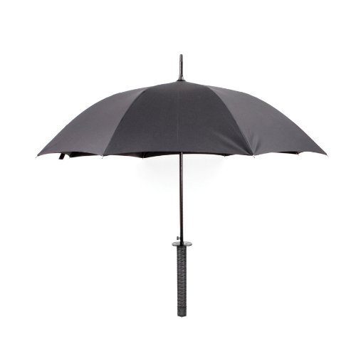 With a Samurai sword handle, you will be begging for rain with our awesome Samurai Umbrella! Unlike ordinary umbrella's, this one kicks ass as you strut down the street with it strapped to your back, ready to whip it out at the very site of a grey cloud. Use your cunning and stealth-like Ninja instincts to detect moisture in the air. Glide your Samurai Umbrella out of its sheath and save the world/ your coat from impending doom/ getting wet by Ming the Merciless/ rain. This large black umbrella is fantastically manly and can be carried around in honour and pride as you hop gayley from puddle to puddle. This top quality umbrella opens at the push of a button and is ideal for impressing friends, co-workers and girlfriends as you make whooshing noises, do that 'Look, I'm pretending to be a dubbed Japanese Ninja film!' voice and jump around like a rabid dog in space boots.