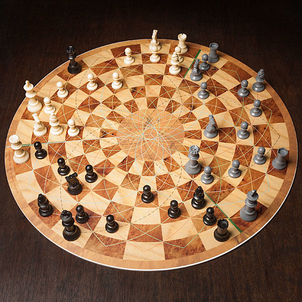 Play chess with 3 people at the same time with this three player chess game. Without compromising any of the rules, strategy, or fun of Chess, this variant board has been developed that accommodates three players. The only changes from conventional chess are some protocol issues that must be followed to maintain order where the teams border each other, which is simple and necessary. The complexities of the third player are infinite. Your threatened piece may be allowed to maintain occupancy as your position is beneficial to the threatening player. But how long can it last? This scenario may exist all over the board. There are multiple trust and doubt situations among all players.