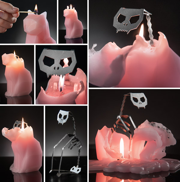 A cute cat shaped candle reveals the wild Beast inside her, a grinning metallic Skeleton with fire blazing in her eyes. It may look like an innocuous wax ornament, but strike a match, light the wick and you will soon see the pyro pet candle for what it really is. Dimensions are 6.7 x 3 x 4.5 inch and burns for approximately 20 hours!