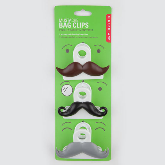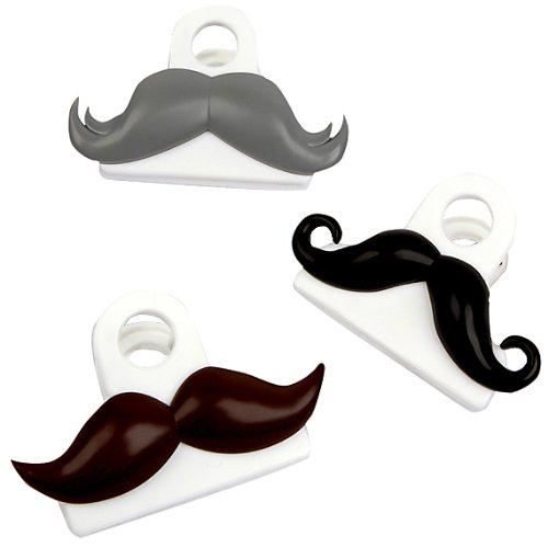 Secure your bags in style with these strong and dashing clips. Perfect for use as a bag clip, note holder or organizing items in your home. Set of 3 clips in assorted mustache styles. Made of durable plastic with chrome iron springs.